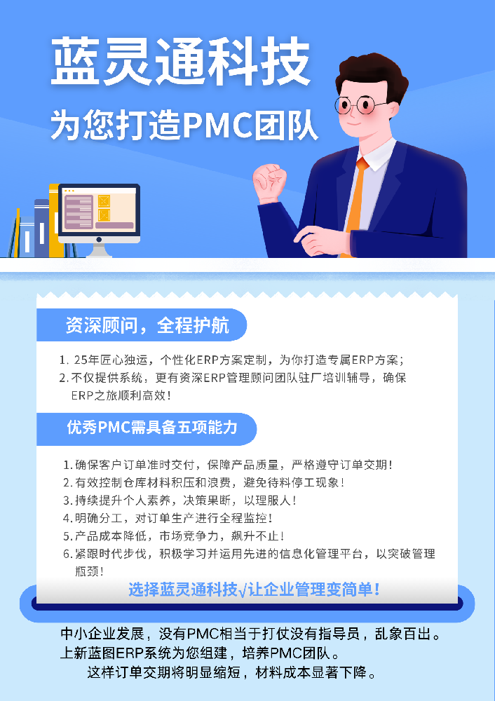 在當今快速變化的市場環境中,制造業正面臨著前所未有的挑戰與機遇。然而,許多工廠卻因傳統PMC(生產計劃與物料控制)管理模式的局限,導致訂單延誤、成本攀升、部門間溝通不暢等一系列問題,嚴重影響了企業的競爭力和可持續發展能力。在此背景下,深圳藍靈通科技以其卓越的PMC管理方案與自主研發的ERP系統,